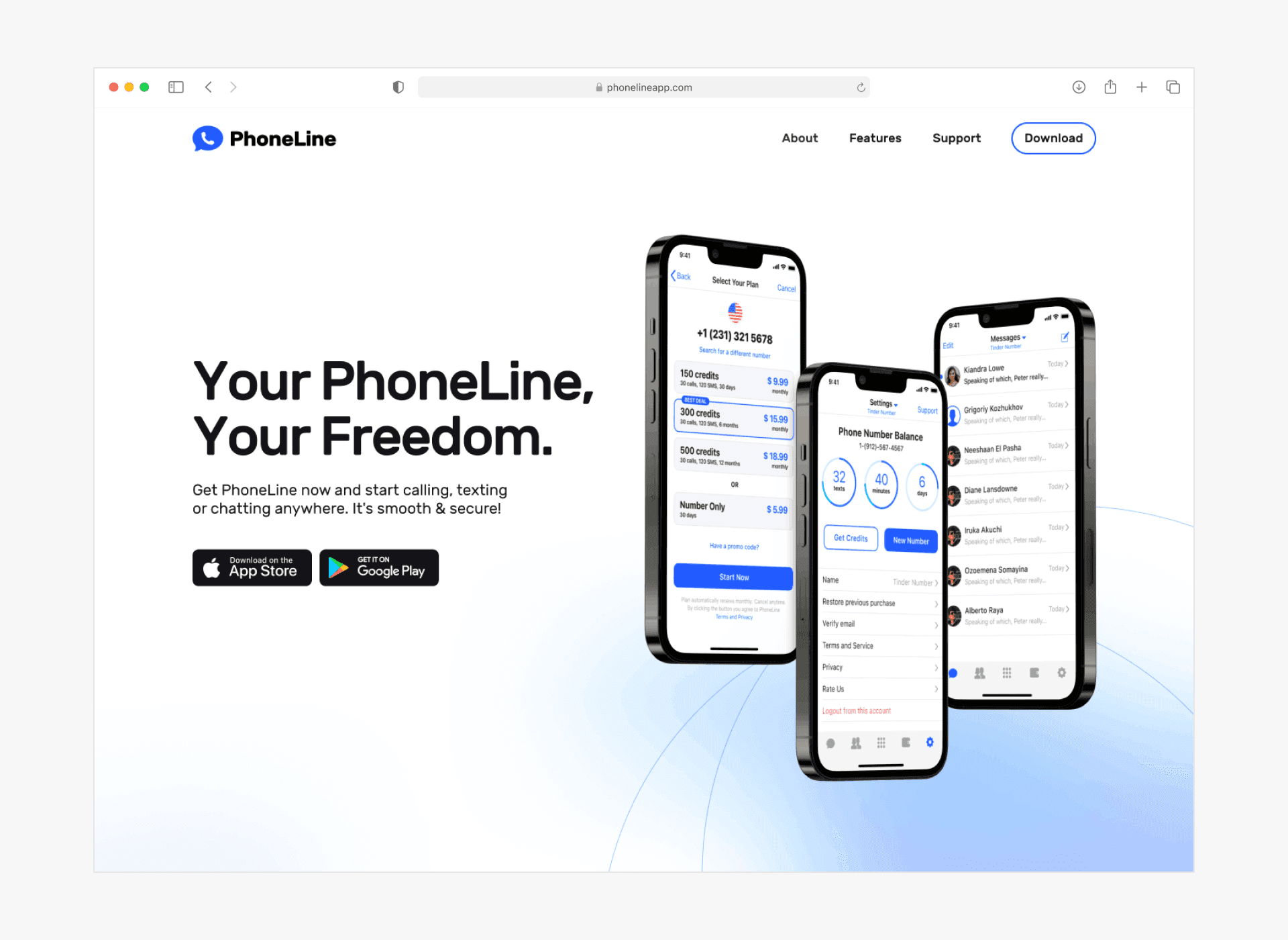 Landing page for Phoneline, showcasing its capabilities as a multi-number management solution, helping users stay connected and organized. Messaging and design emphasized productivity and organization, resulting in a 50% lift in trial sign-ups after launch.