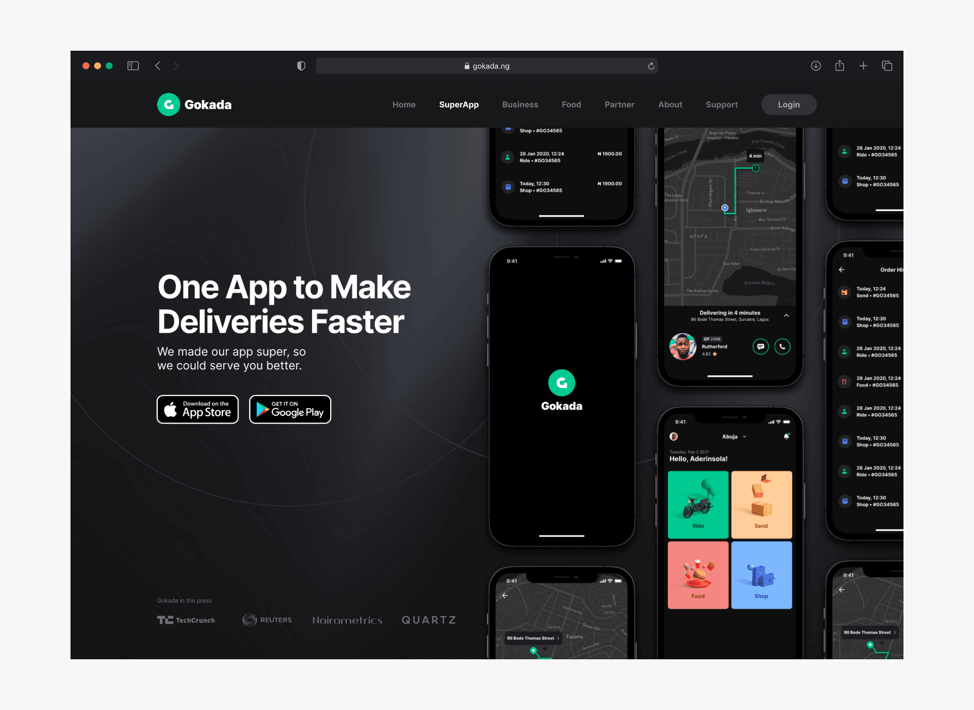 A responsive marketing and onboarding website for Gokada’s multi-service app. The site highlights services like ride-hailing, parcel delivery, and food dispatch, while guiding users toward app downloads or partnership registration. The layout and visual language were designed for mobile-first use, emphasizing clarity and conversion. The redesign led to a 35% increase in app install conversions and higher partner sign-ups.