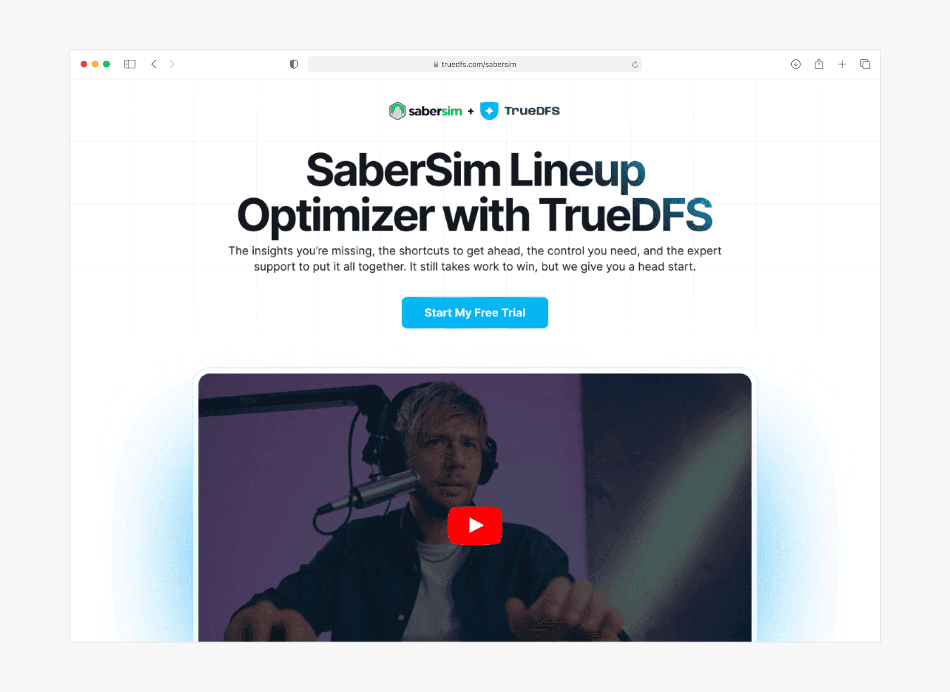 A joint landing page for SaberSim and TrueDFS, two brands specializing in sports analytics and fantasy sports tools, combining resources to offer expert insights and tools for fantasy sports enthusiasts. Post-launch, bounce rate dropped by 18%, and email sign-ups grew by 27%.